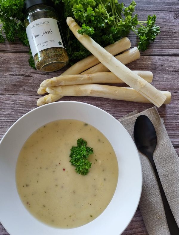 Den Spargel schälen und die Enden abschneiden. Die Schalen und die Enden mit 1250 ml Wasser, 1 geh. TL Meersalz und 1/2 TL Zucker 30 Min. köcheln lassen. In der Zwischenzeit den Spargel in gleichmäßige Stücke schneiden. Schalen und Enden aus dem Wasser abschöpfen, die Spargelstücke dazugeben und 12-15 Minuten garen. Den Spargel abgießen und 1 Liter des Spargelwassers abmessen. Butter in einem Topf erhitzen und das Mehl darin leicht anschwitzen. Unter Rühren nach und nach das Spargelwasser und die Sahne dazugeben. Mit Vino Verde, Sanfte Traube und ggf. mit Meersalz und Regenbogen Pfeffer nach Geschmack würzen. Die Spargelstücke zurück in die Suppe geben und kurz erhitzen. Wer mag kann mit frischer Petersilie und/oder einem Klecks geschlagener Sahne garnieren.
